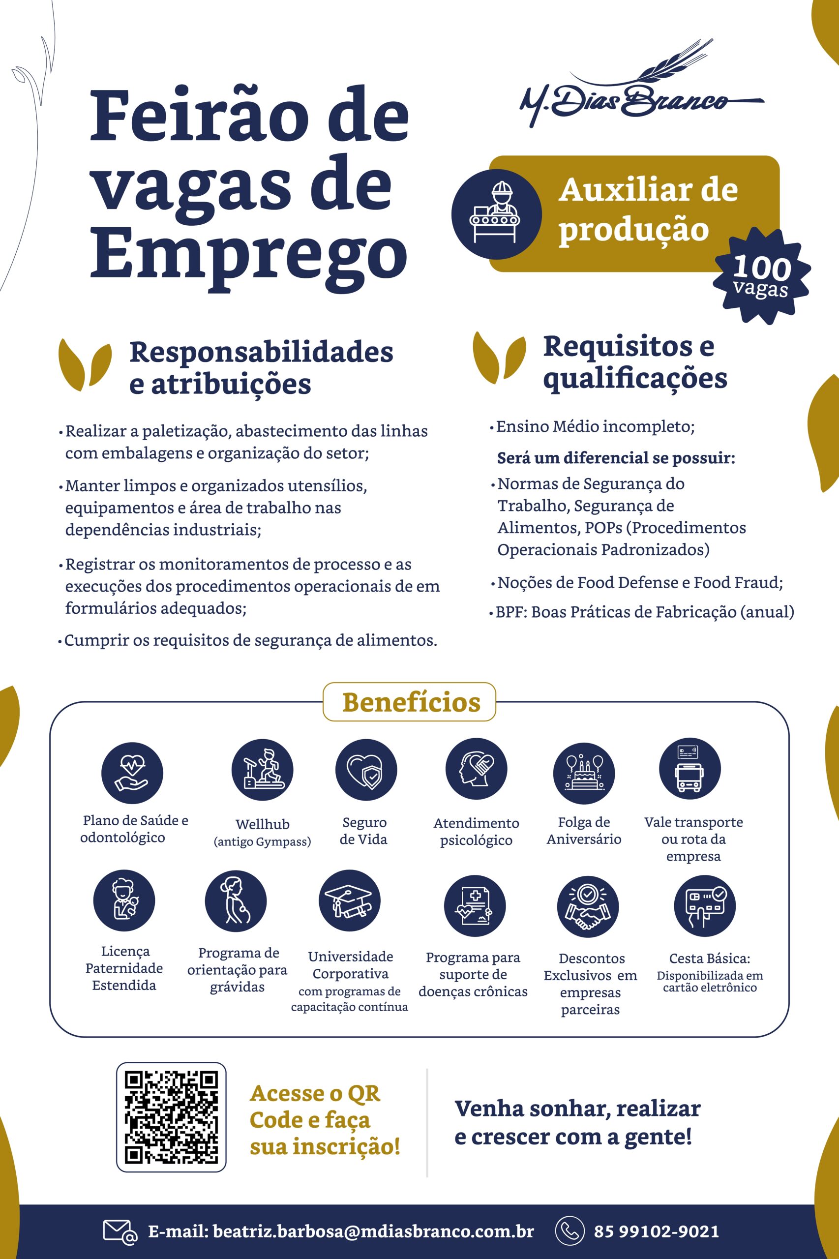 A M. Dias Branco, líder nacional em massas e biscoitos, promove um Feirão de Vagas de Emprego no Ceará com a oferta de 100 oportunidades para o cargo de Auxiliar de Produção, com início imediato. As vagas são destinadas à unidade de Eusébio e contemplam candidatos com ensino médio completo, reforçando a geração de emprego e renda no estado.